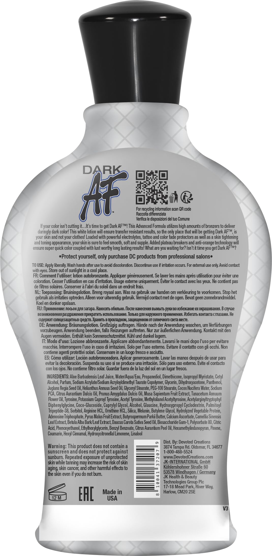 Devoted Creations Dark AF is a 12.25 oz tanning cream that combines a transfer-resistant DHA bronzer with a body-balancing BB crème formula. It protects tattoos and colors from fading while eliminating after-tan odors, all wrapped in a delightful Passionfruit Punch fragrance. Suitable for all skin types, this product is designed for those who want a flawless tan without compromise.